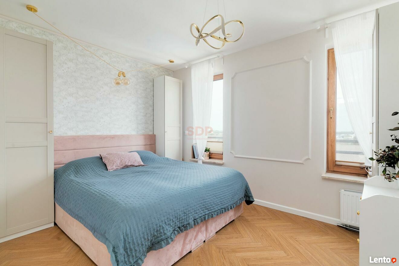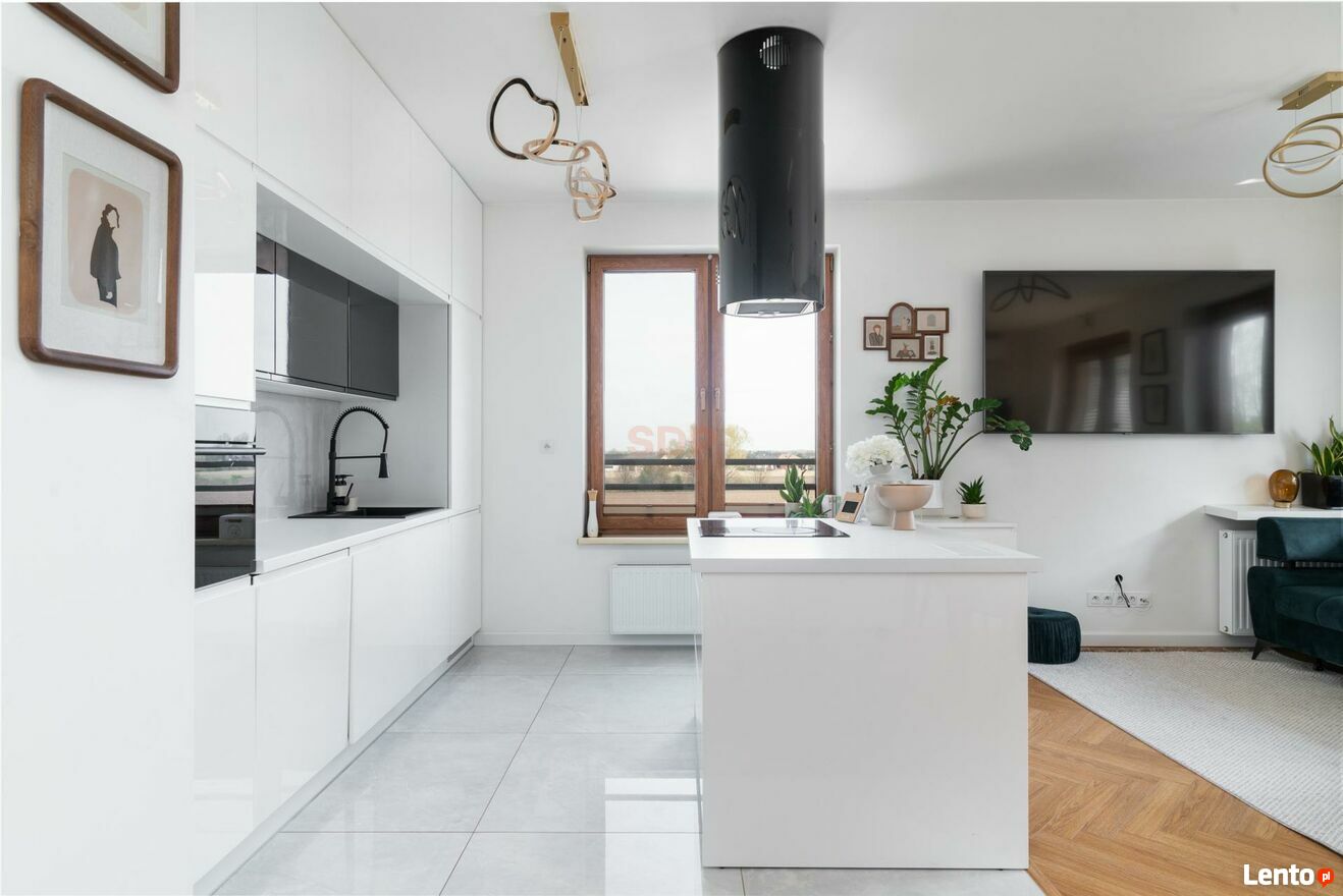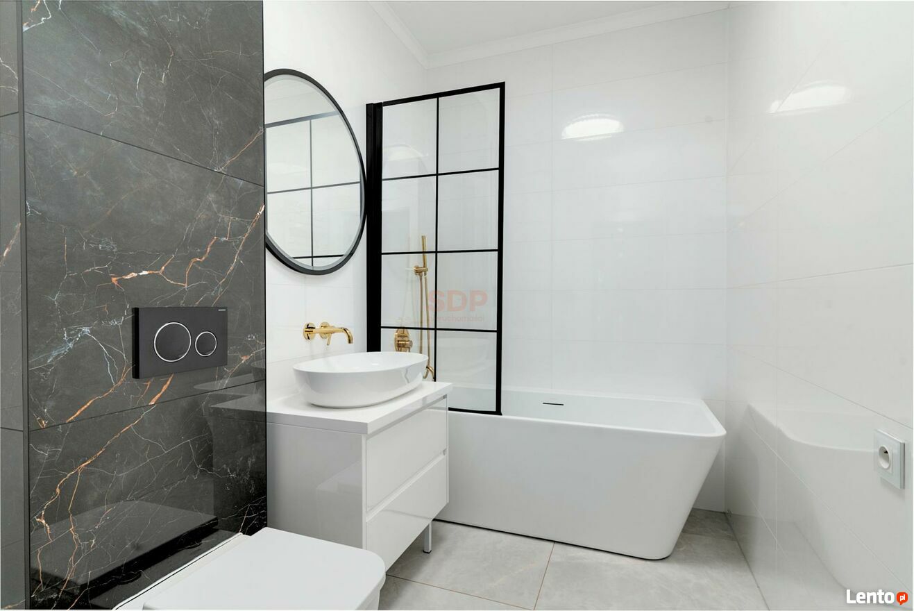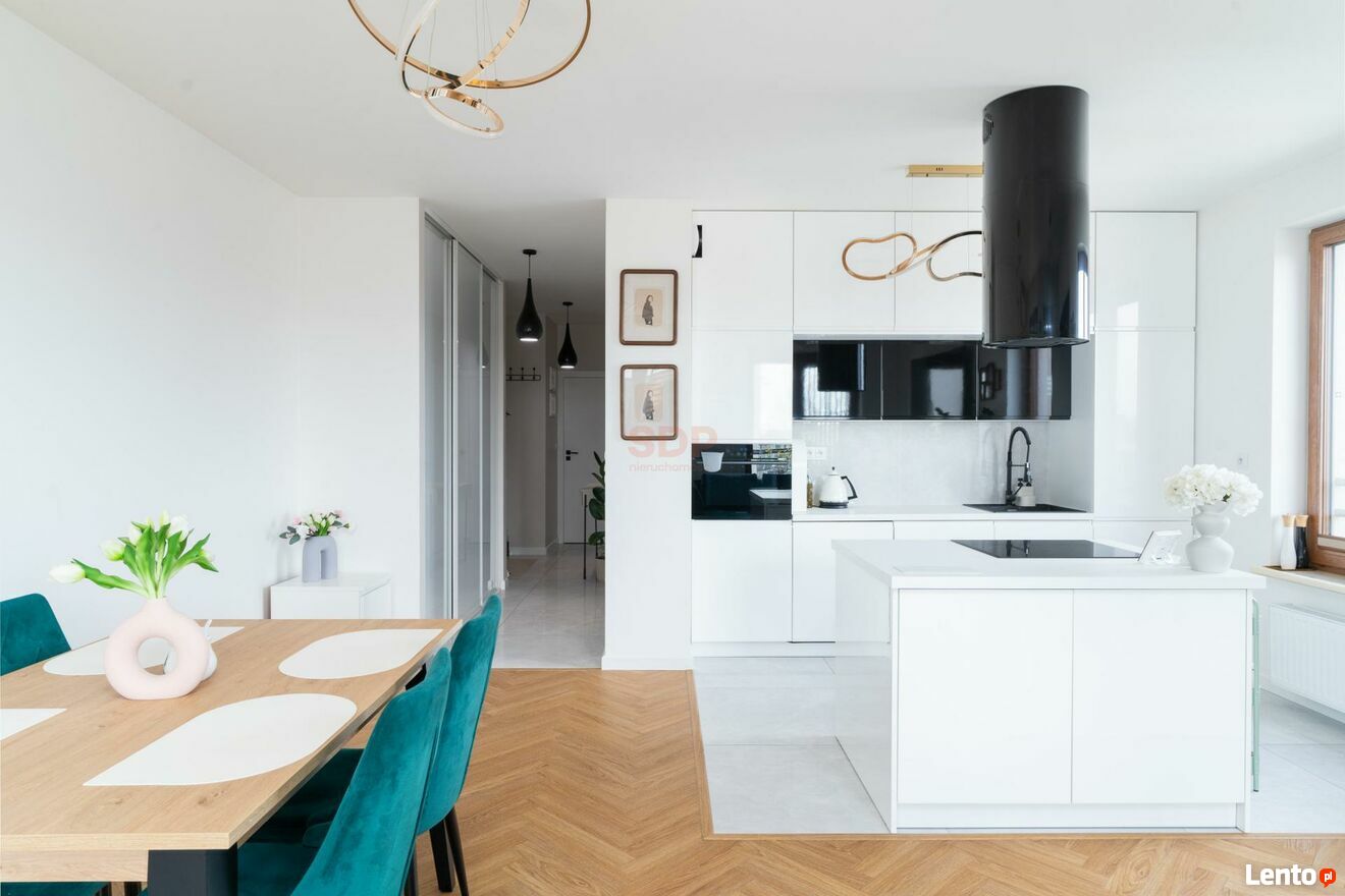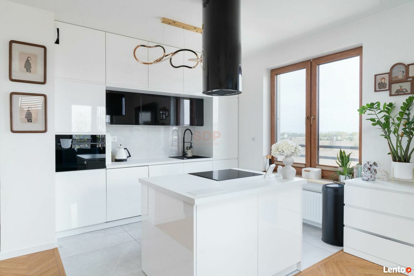 Nowoczesne wnętrze zachwyca przestronnym układem pomieszczeń i unikatowymi, szytymi na miarę elementami, nadającymi przestrzeni niepowtarzalny charakter. Każdy detal - od efektownych podłóg po eleganckie drzwi wykonane z naturalnego drewna - świadczy o zastosowaniu materiałów najwyższej klasy, co wprowadza aurę prestiżu i luksusu.